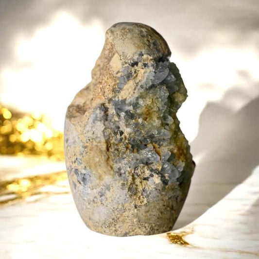 Ob als stilvolles Dekorationsstück, als Teil einer Sammlung oder als feiner Schmuck – diese Kollektion bringt die ganze Leuchtkraft und Zartheit von Celestit zur Geltung.