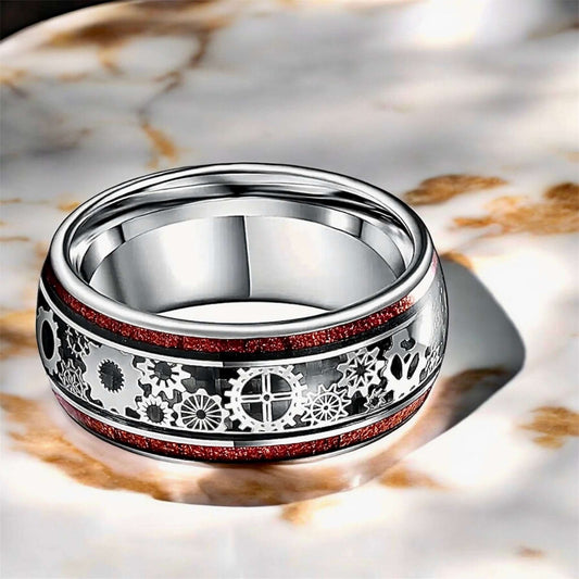 Ring mit Holzmaserung und Zahnrädern – im mechanischen Stil