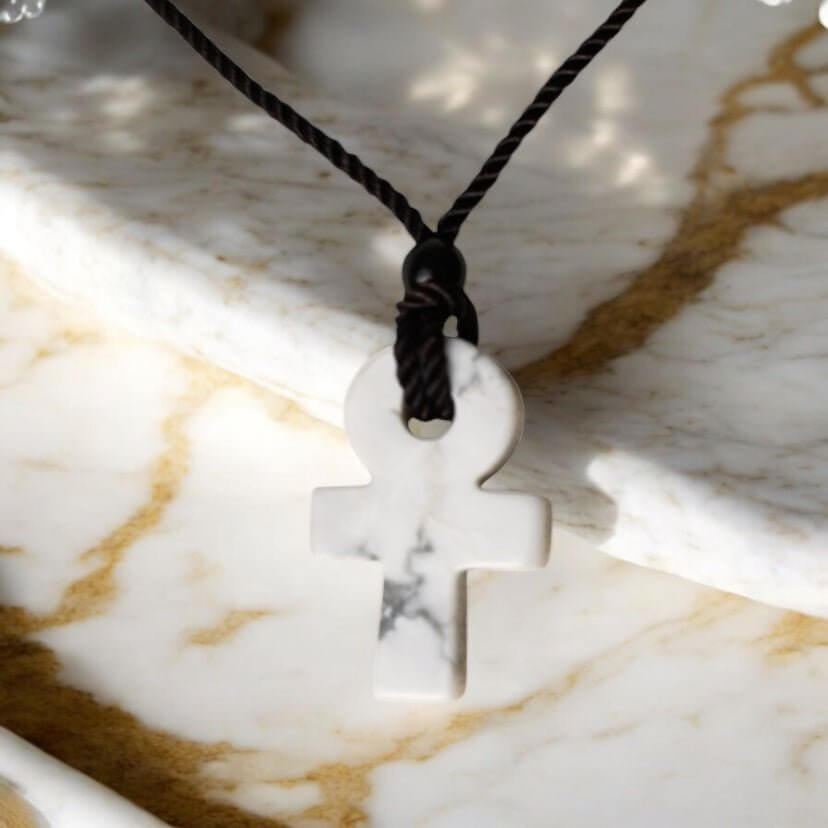 Der Anhänger aus Howlit steht für Ruhe, Ausgeglichenheit und mentale Klarheit. Howlit ist bekannt für seine beruhigende Wirkung, die in stressigen Situationen für Gelassenheit und innere Stärke sorgt. Das natürliche Material macht jede Halskette zu einem individuellen Schmuckstück mit subtiler Kraft und authentischem Charakter. Ob als stilvolles Geschenk oder als persönliches Statement – diese Halskette verbindet elegantes Design mit energetischer Wirkung.