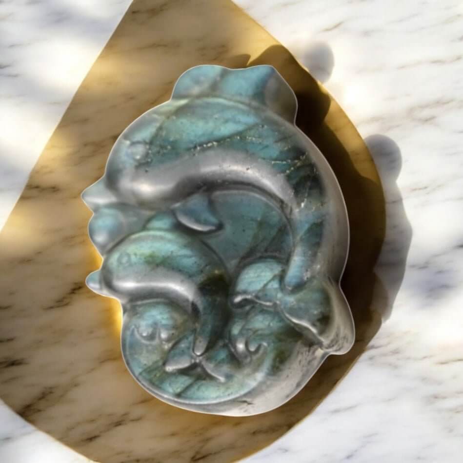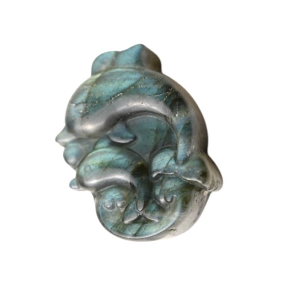 Der Delfin steht für Leichtigkeit, Lebensfreude und spielerische Energie. In Kombination mit Labradorit, dem sogenannten Seelenstein, der Intuition, Schutz und innere Klarheit fördern soll, entsteht ein harmonisches Zusammenspiel. Dieses Einzelstück lädt dazu ein, den eigenen Alltag mit mehr Gelassenheit und Inspiration zu bereichern. Durch sein handliches Format eignet sich der Kristall perfekt für den Schreibtisch, den Nachttisch oder als kleiner Begleiter im Alltag.